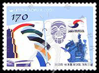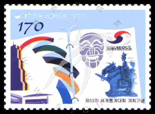 汉城第53届国际统计学会(ISI)会议,面具、骑兵俑、彩带及会堂建筑等1全