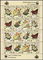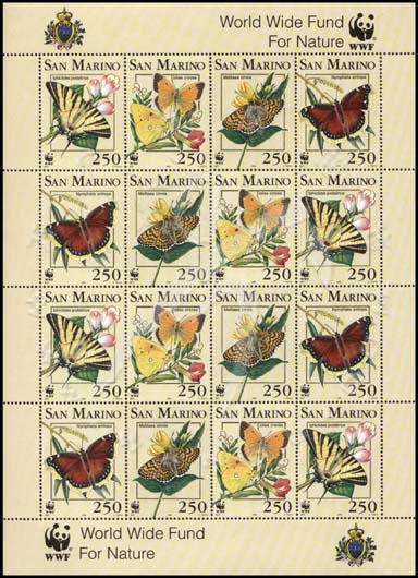 蝴蝶,旖凤蝶、黄云斑蝶、丧服蛱蝶、庆网蛱蝶及WWF野生动物基金会徽志小版张(4套共16票)