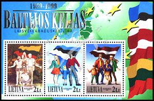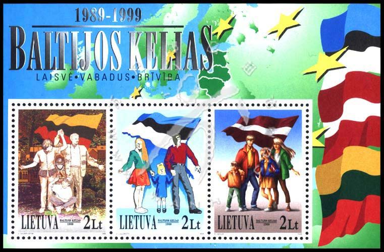 波罗的海之路(联接三国首都的人体链)10周年,立陶宛、爱沙尼亚、拉托维亚国旗、家庭及版图等小全张(3票,波罗的海三国联合发行)