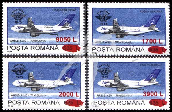 国际民用航空组织(ICAO)成立50周年,飞机—空中客车A310加盖齐柏林飞艇改值航空票4全