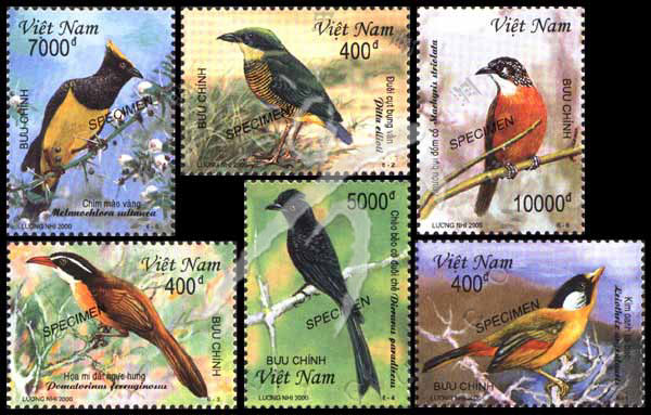 鸟类,银耳相思鸟、斑腹八色鸫、钩嘴鹛、大盘尾、冕雀及斑颈穗鹛样票6全