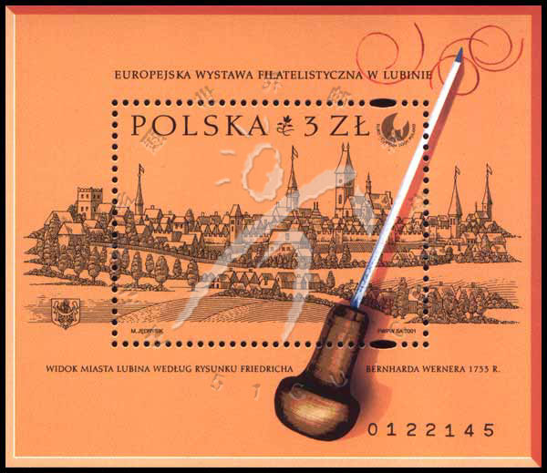 卢布林2001年欧洲邮展,邮展徽志、18世纪卢布林全景及早期铜器等小型张