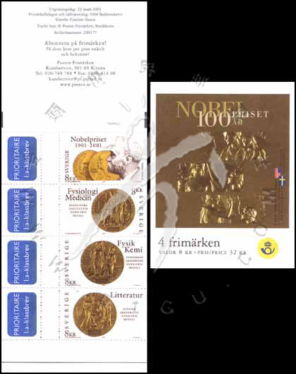 诺贝尔奖百年,诺贝尔和诺贝尔文学奖、医学奖、化学奖奖章小本票(4票,与美国联合发行)