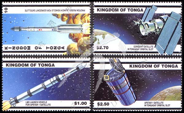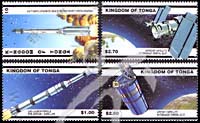 2000年美国世界邮展,在汤加轨道狭槽上的卫星及卫星搭乘火箭点燃升空(烫银)4全
