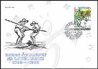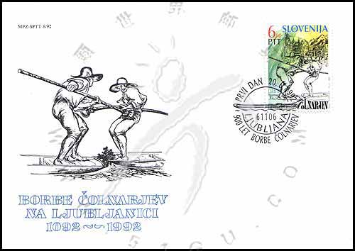 首都卢布尔雅那河的船夫技艺比赛900周年,在船头切磋技艺的船夫及河流沿岸风景等绘画1全邮票首日封