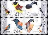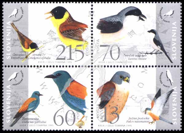 斯洛文尼亚濒危鸟类,徽志、伯劳鸟、佛法僧、黑头颊白鸟、红隼等4联
