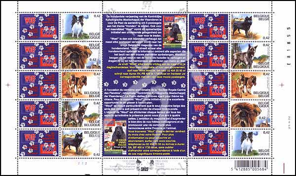 宠物狗,史奇派克犬、法兰德斯牧牛犬、寻血警犬、布鲁塞尔翘鼻犬及蝶耳狗小版张(2套共10票,各带1枚附票)