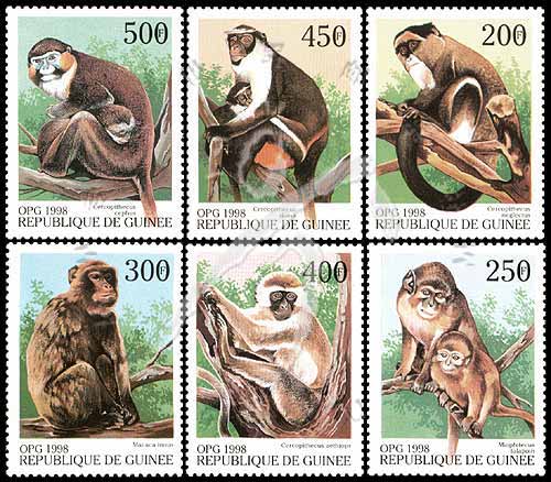 猴,白臀长尾猴(200f`)、绿猴(400f)、黛安娜鬚猴(450f)等(6全) 1枚