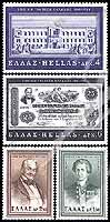 希腊国家银行125周年,J.G.埃纳德(1775-1863)、G.斯特夫洛斯(1788-1869)、银行总部及1867年25德提支马纸币雕刻版4全