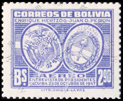 Sc#C118 玻利维亚和阿根廷总统会晤,两国国徽航空票2.90b 1枚