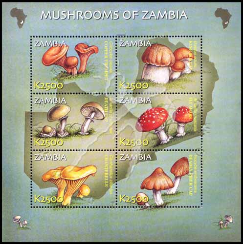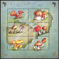 蘑菇,美味牛肝菌、毒蝇鹅膏、丝盖伞、杯伞、鸡油菌小版张(6票)