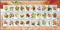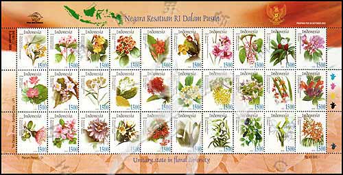 印尼30省省花,安息香、夹竹桃、凤蝶兰、闭鞘姜、荷花、海棠、散尾葵、阿勃勒、半角瓜、西香莲、长花百合等小版张(30票)