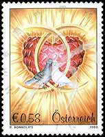 结婚纪念邮票,金色戒指、两只鸽子和红色的心型图案1全