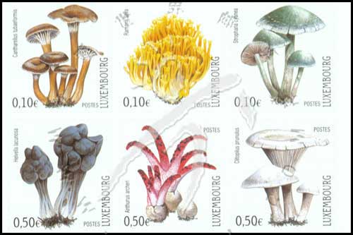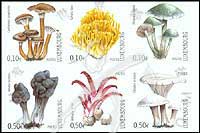 蘑菇,鸡油菌、黄枝瑚菌、蓝球盖菇、黑马鞍菌、鱿鱼菇及担子菌不干胶自贴票6联