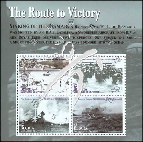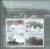 二战胜利60周年,“俾斯麦”号战舰路线图及沉没场景小版张(4票)