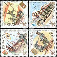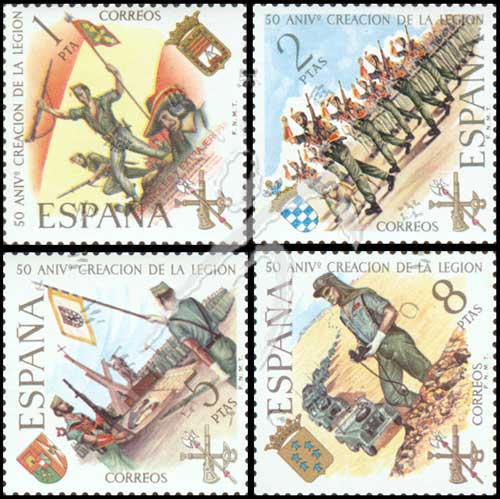 西班牙志愿军团成立50周年,军团士兵、国旗、军团旗、阅兵式、入伍宣誓、斯马拉的纪念碑及沙漠摩托化部队菱形票4全