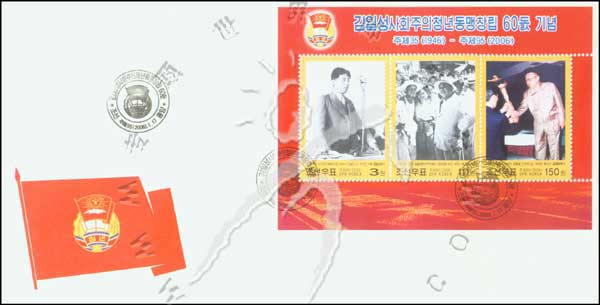 金日成社会主义劳动青年同盟成立60周年,金日成演讲、与青年在一起及移交火炬给革命先锋小全张首日封