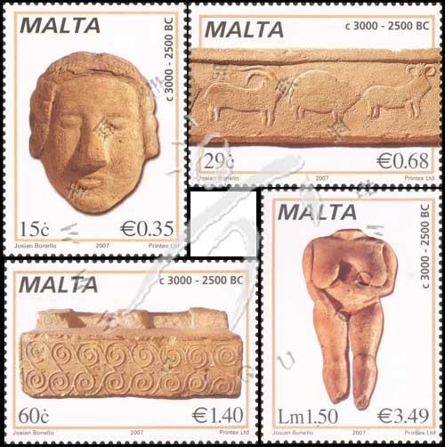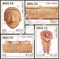 马尔他史前雕塑,泥塑头像、石灰石雕塑、浅浮雕及1839年在巨石神殿出土的石塑《无头仕女》4全(含高面值票)