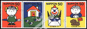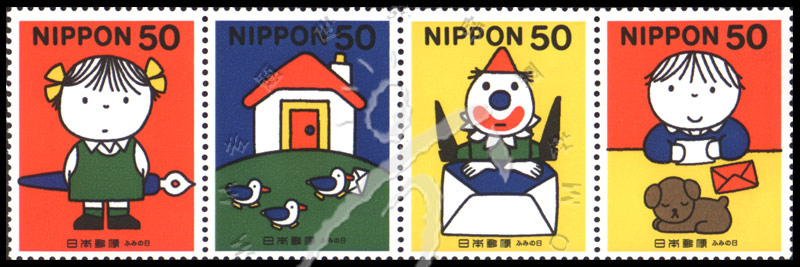 书信日,卡通画:写信、小鸭送信、书信你好及读信4联
