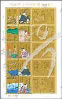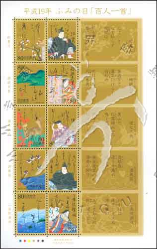书信日,古典诗歌集《百人一首》,和歌诗人纪贯之、持统天皇、猿丸大夫、源兼昌、二条院赞岐及书法小版张(10票)