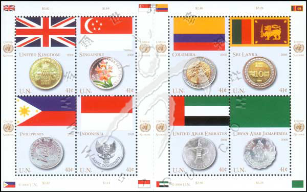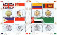 国旗和钱币系列三,英国、新加坡、哥伦比亚、斯里兰卡、菲律宾、印度尼西亚、阿联酋及利比亚国旗和钱币小版张(8票)