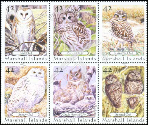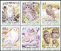鸟类—猫头鹰,仓鸮、林鸮、穴鸮、雪鸮、大角鸮及西点林鸮6联(我社已售缺)