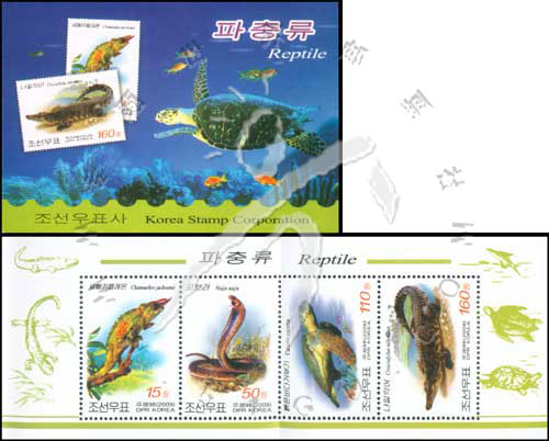 爬行动物,杰克森变色龙、印度眼镜蛇、红海龟及尼罗鳄小本票(4票)