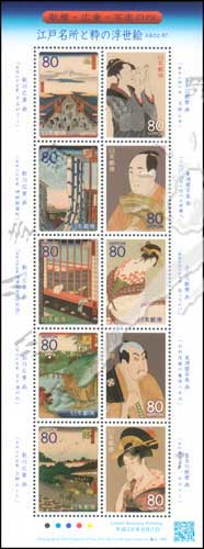 故乡邮票—江户时代的浮世绘,浮世绘大师歌川广重、喜多川歌磨及东洲斋写乐的绘画小版张(10票)