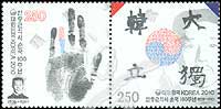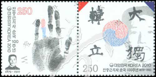 爱国烈士安重根逝世百年,肖像、手纹及文字“大韩独立”2联