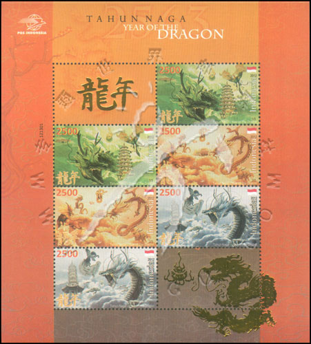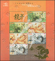 龙年生肖,宝塔及水龙小版张(2套共6票,带附票为金箔龙年及游龙戏珠)