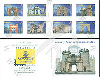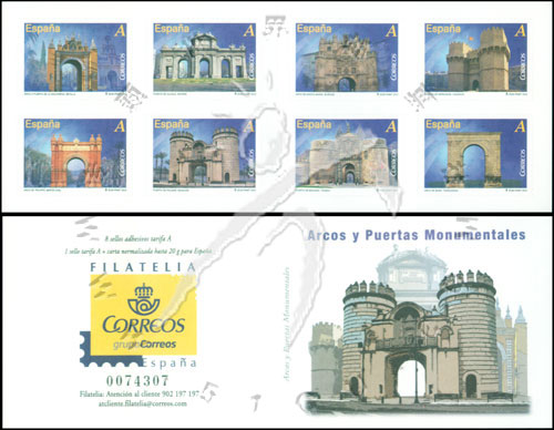 著名拱门和城门,塞维利的玛卡里拱门、马德里的阿尔卡拉门、博格斯的圣母门及奥古斯的巴拉拱门不干胶自贴小本票(8票)