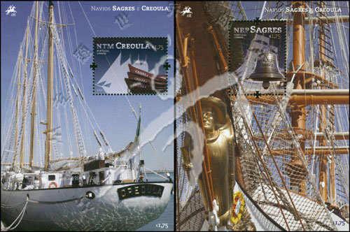 大型帆船,萨格瑞斯号和Creoula号船上的桅杆、响铃及甲板等船上构造2枚小型张