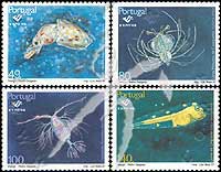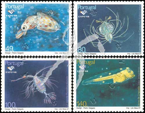 里斯本98世界博览会系列一,海洋浮游生物鱿鱼、羽小角水蚤及地中海鳎等4全