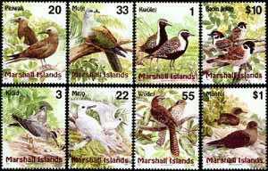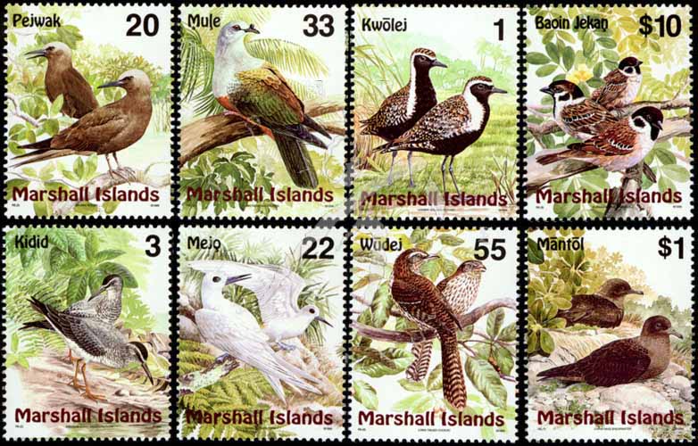 马绍尔群岛上的鸟类普票系列一,金斑鸻、西伯利亚灰尾鹬、玄燕鸥、燕鸥、密克皇鸽、长尾杜鹃、黑鹱及麻雀8全(含高值票)