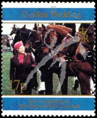 邮票介绍:Sc#214 伊丽莎白女王二世和菲利普50年金婚,女王观马17p (6-3) 1枚