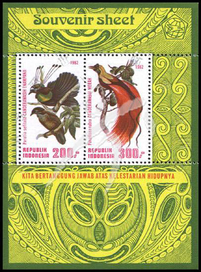 极乐鸟,阿法六线凤乌及红色极乐鸟小全张(2票)