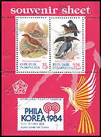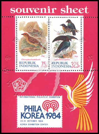 韩国世界邮展,徽志、黄胸大亭鸟及华美凤鸟小全张(2票)