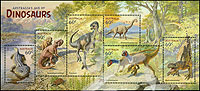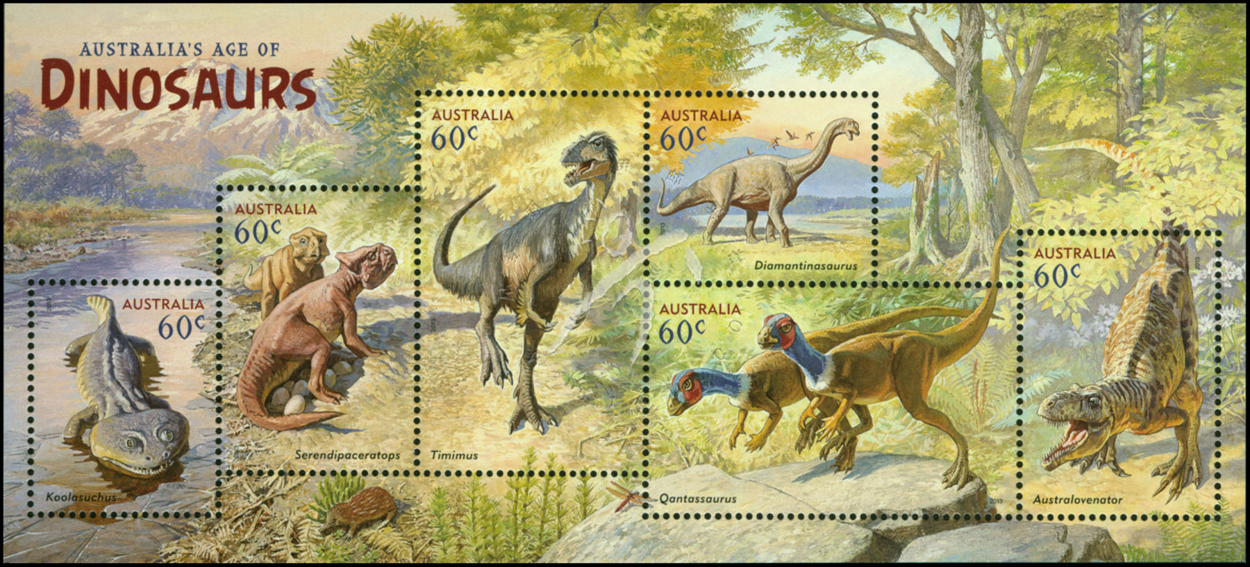 恐龙,酷拉龙、巧合角龙、提米穆斯龙、快达龙、迪亚曼迪纳龙及南方猎龙小全张(6票)