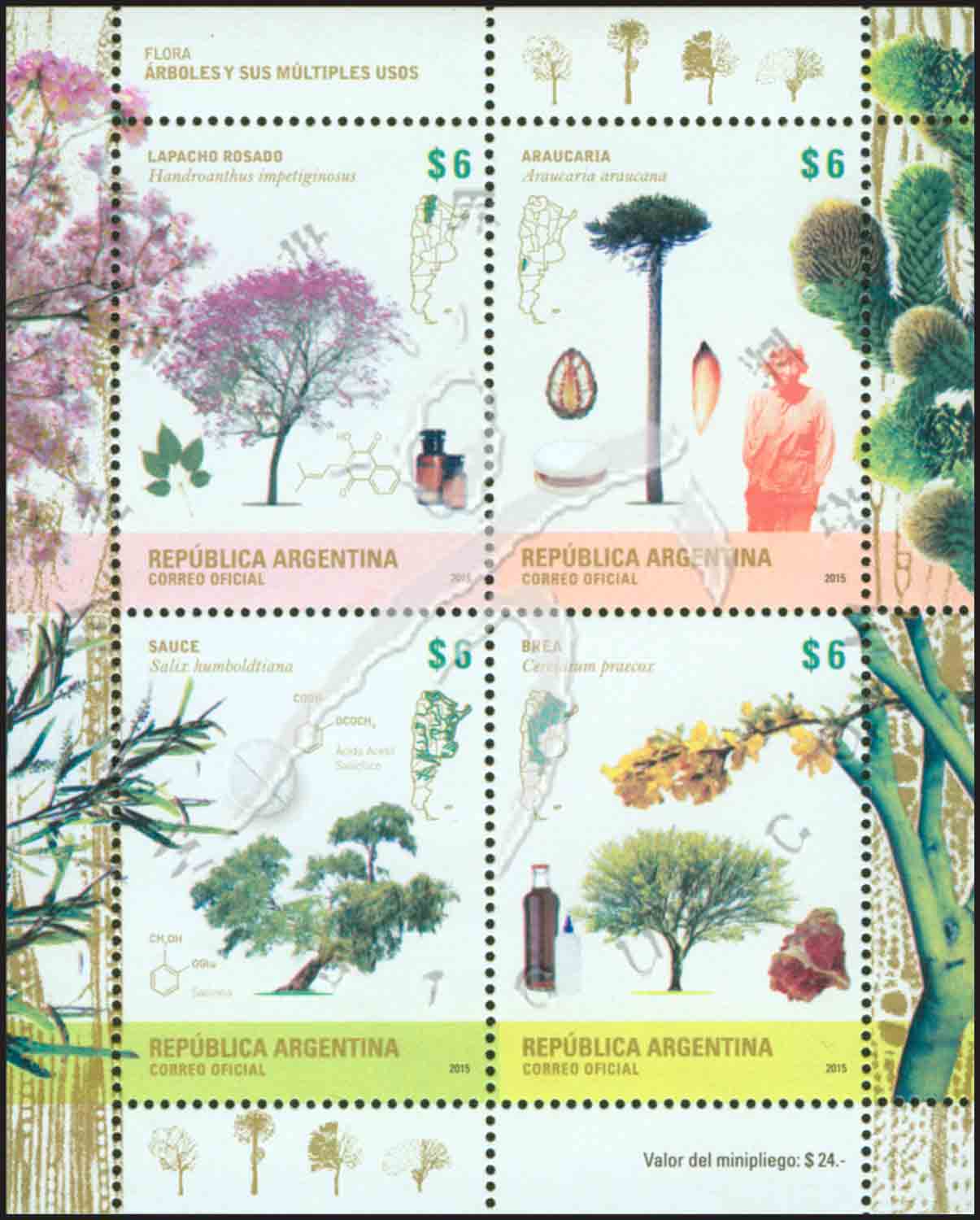 树木,紫花风铃树、猴爪杉、密齿柳及鲜竹树小全张(4票)