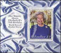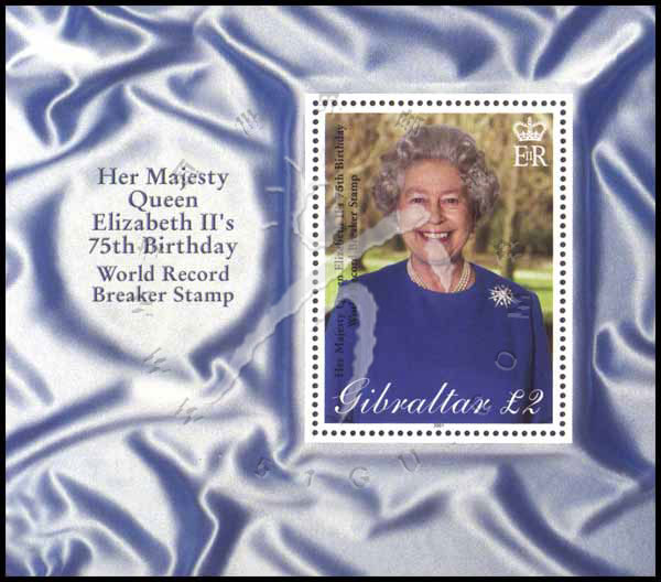 “女王伊丽莎白二世75岁生日,本邮票打破世界纪录”,伊丽莎白像小型张