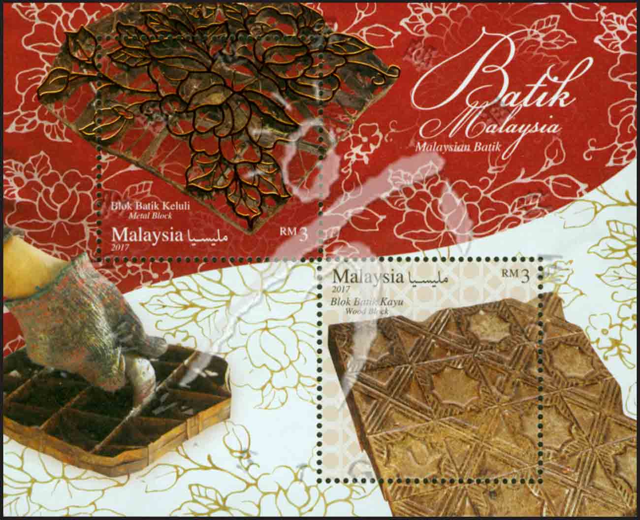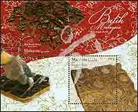 马来西亚蜡染,木质及金属蜡染模具金属材质涂层及凹凸压印票小全张(2票)