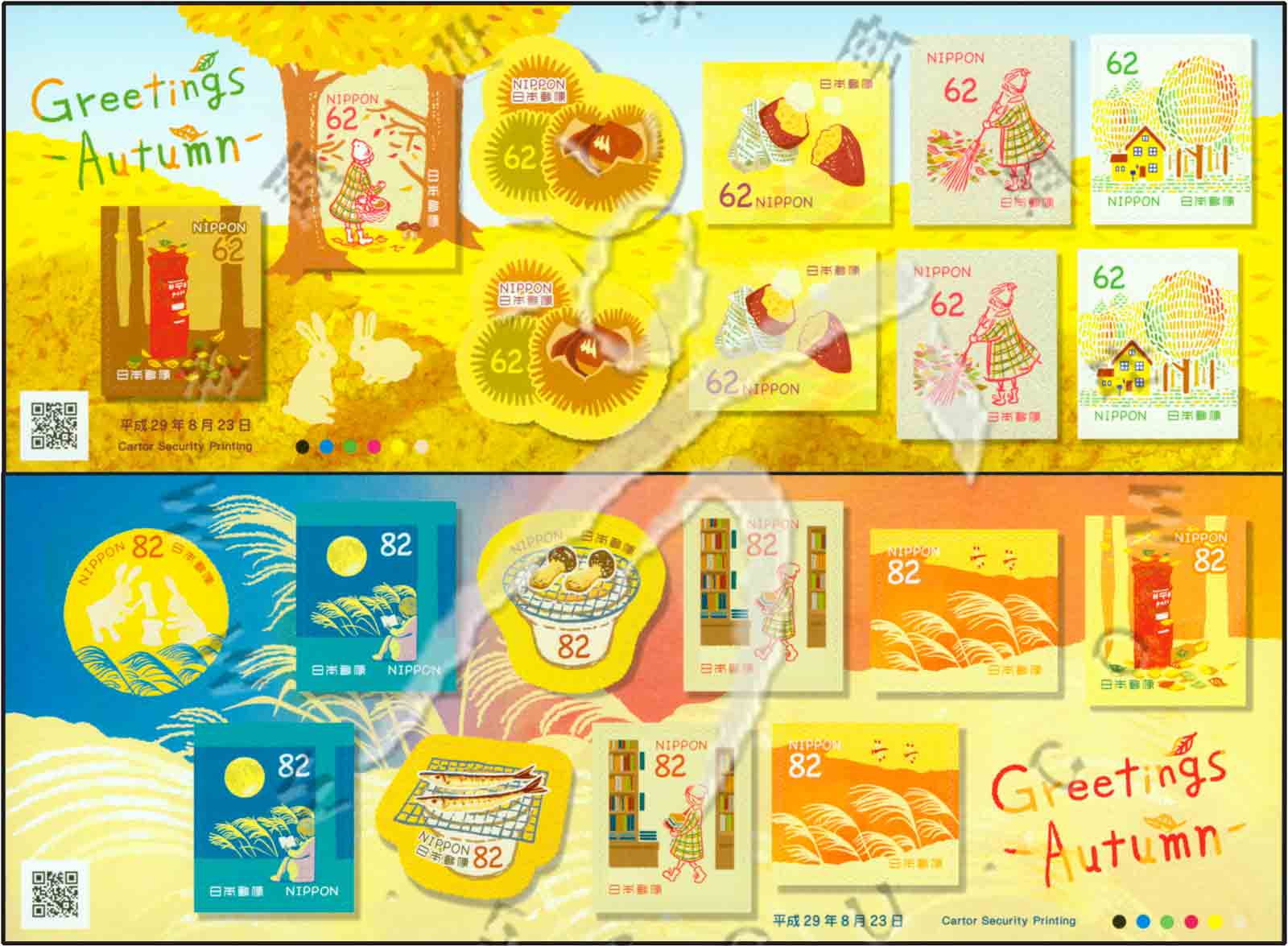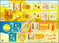 森林礼物系列一,蘑菇、秋刀鱼、邮箱、板栗、甘薯、兔子等不干胶自贴异形票小版张2枚(各10票)