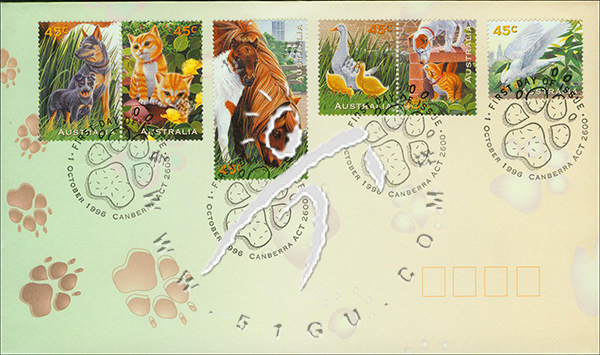 宠物,狗、马、葵花凤头鹦鹉、鸭及小猫等首日封(6票)