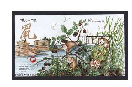 奥兰岛2020年生肖鼠小全张含2票,由世界著名设计师马丁.莫克设计,老鼠嬉戏的全景图。5只老鼠是田鼠和黄颈鼠在草丛中打滚吃黑莓。