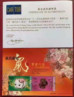 香港2020年生肖鼠金银邮票小型张含2票,“宝猪巧鼠”邮票小型张上的猪年及鼠年分别以银箔烫压和22K镀金金片制作,面值100港元有质保证明。