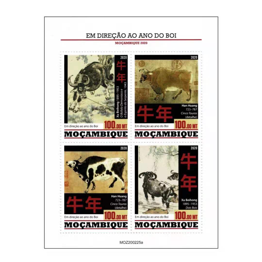 莫桑比克2020年发行2021年生肖牛小全张含4票,图案用中国水墨画形式表现牛的各种形态