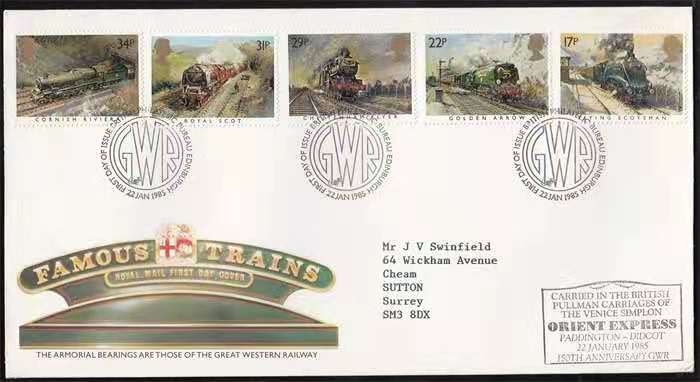 英国1985年蒸汽火车发展史(5票全)首日实寄封