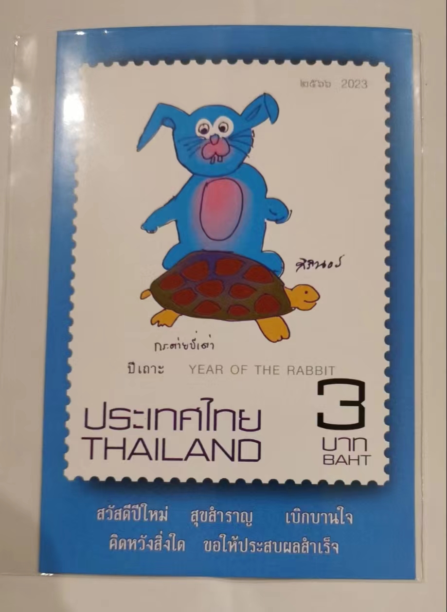 泰国2023年生肖兔邮票1全邮票上的卡通蓝色兔图案由诗琳通公主亲手绘制