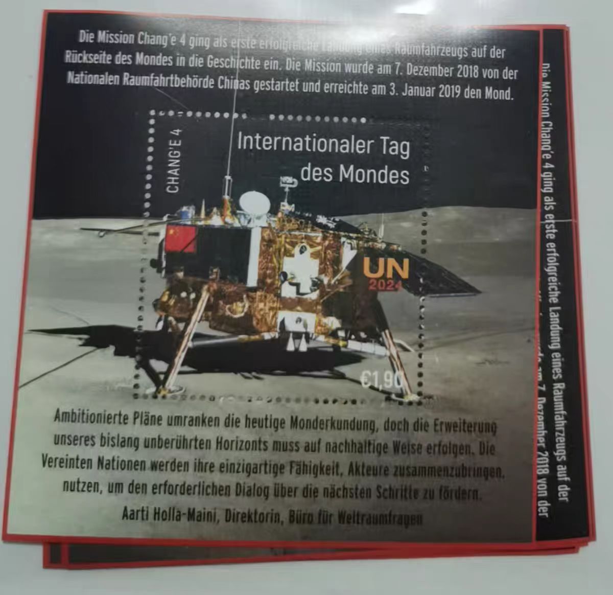 联合国2024年7月20日国际月球日发行中国嫦娥4号邮票小型张1全