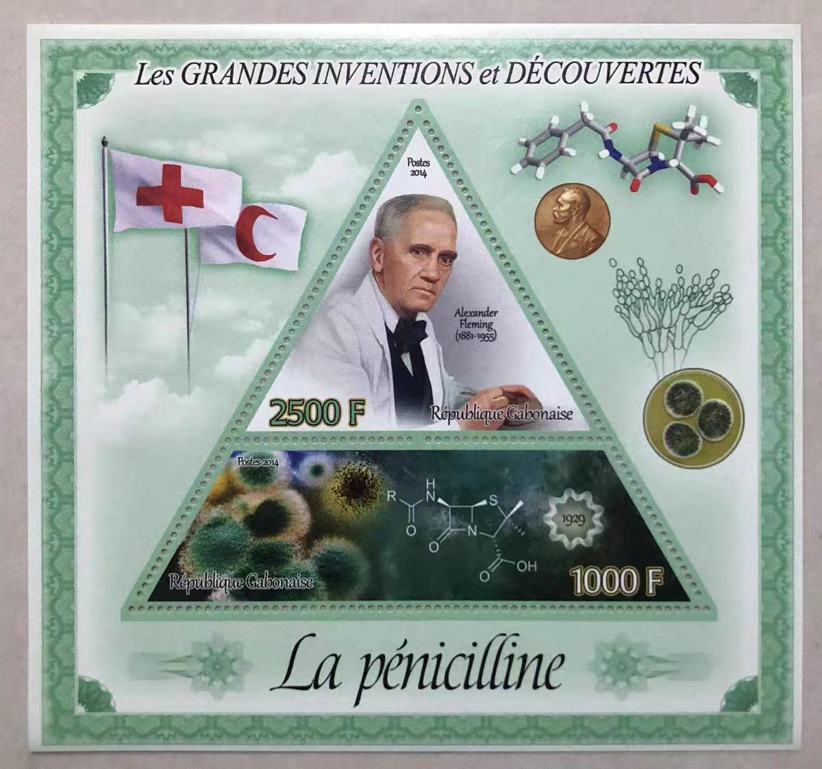 加蓬2014年诺贝尔医药奖获得者弗莱明发明青霉素三角形梯形邮票小全张含2票